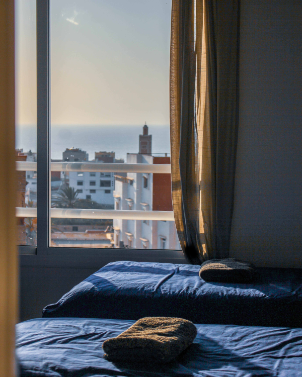 Das Camp liegt im Herzen von Tamraght, nur wenige Gehminuten vom Meer entfernt. Du wohnst in einem liebevoll geführten Surfhouse mit Meerblick-Terrasse, hellen Doppel- oder Mehrbettzimmern und gemütlichen Gemeinschaftsbereichen. Alles ist sauber, entspannt und familiär – ideal, um nach dem Surfen abzuschalten oder neue Leute kennenzulernen.